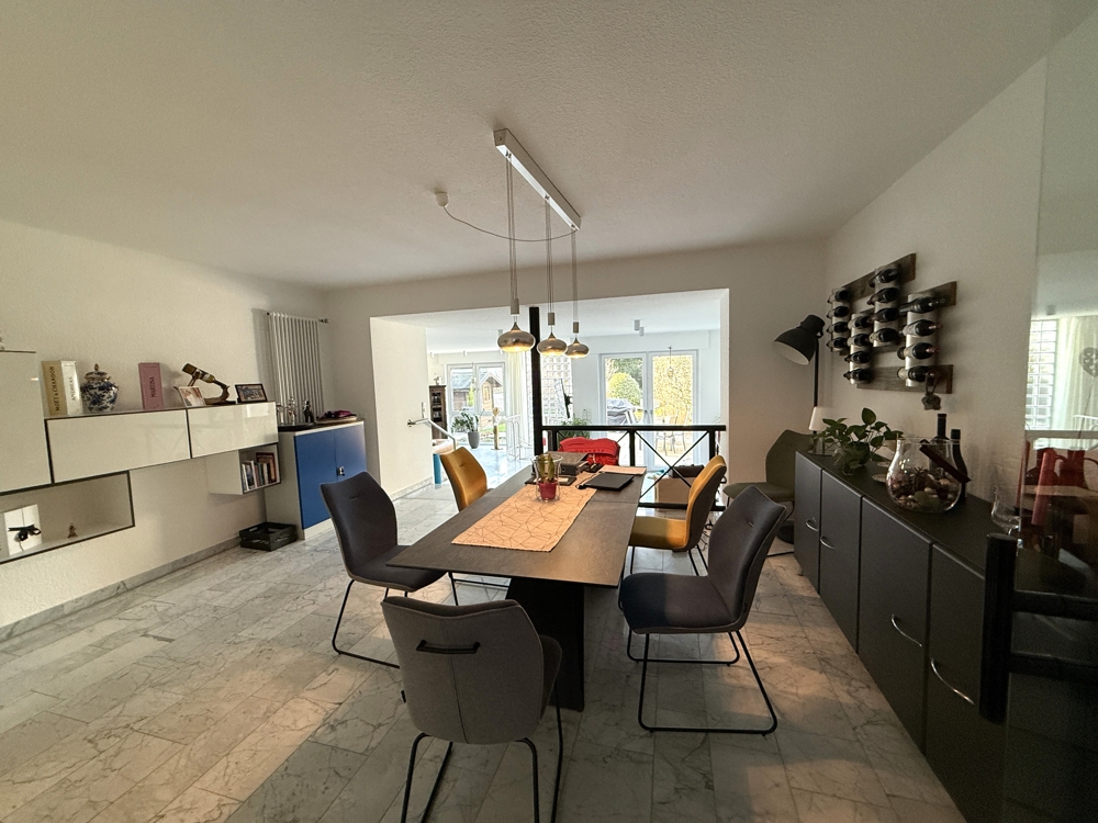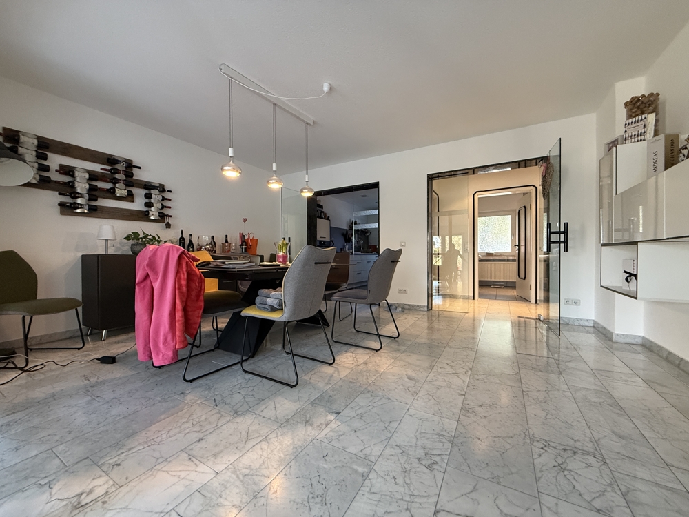 Diese attraktive Erdgeschosswohnung mit einer Wohnfläche von ca. 135 m² befindet sich im Erd- und Kellergeschoss eines gepflegten Dreifamilienhauses in zentraler Lage von Gladbeck-Mitte. Die Wohnung überzeugt durch ihre großzügige Raumaufteilung, eine besondere Split-Level-Architektur sowie eine hochwertige Ausstattung und bietet ein außergewöhnliches Wohnambiente mit direktem Gartenbezug. Über die einladende Diele gelangen Sie in die Küche, das Schlafzimmer sowie in das moderne, barrierefreie Badezimmer, das mit einer großzügigen bodengleichen Dusche ausgestattet ist. Herzstück der Wohnung ist der offen gestaltete Wohn- und Essbereich, der durch seine Split-Level-Anordnung architektonisch reizvoll gestaltet ist. Ein Kamin sorgt für eine angenehme Wohnatmosphäre, während der elegante weiße Marmorboden und die gasbetriebene Fußbodenheizung den hohen Ausstattungsstandard unterstreichen. Große Fensterflächen lassen viel Tageslicht in die Räume und öffnen den Wohnbereich direkt zum Garten, wodurch Innen- und Außenraum harmonisch miteinander verbunden werden. Im Kellergeschoss der Wohnung stehen ein weiteres Schlafzimmer, ein zusätzliches Badezimmer, ein Hauswirtschaftsraum sowie eine Sauna zur privaten Nutzung zur Verfügung. Ergänzend bietet ein renovierter Kellerraum ausreichend Stauraum für persönliche Gegenstände. Der angelegte Garten mit Teich und Geräteschuppen lädt zum Entspannen und Verweilen ein und bietet einen hohen Erholungswert inmitten der Stadt. Die Gartenfläche ist direkt vom Wohnbereich aus zugänglich und erweitert den Wohnraum ideal in den Außenbereich. Eine zur Wohnung gehörende Garage sowie ein zusätzliches Carport bieten komfortable Parkmöglichkeiten. Die zentrale Lage in Gladbeck-Mitte ermöglicht eine gute Anbindung an öffentliche Verkehrsmittel sowie kurze Wege zu Einkaufsmöglichkeiten, Ärzten, Schulen und weiteren Einrichtungen des täglichen Bedarfs. Wir freuen uns auf Ihr Anfrage!