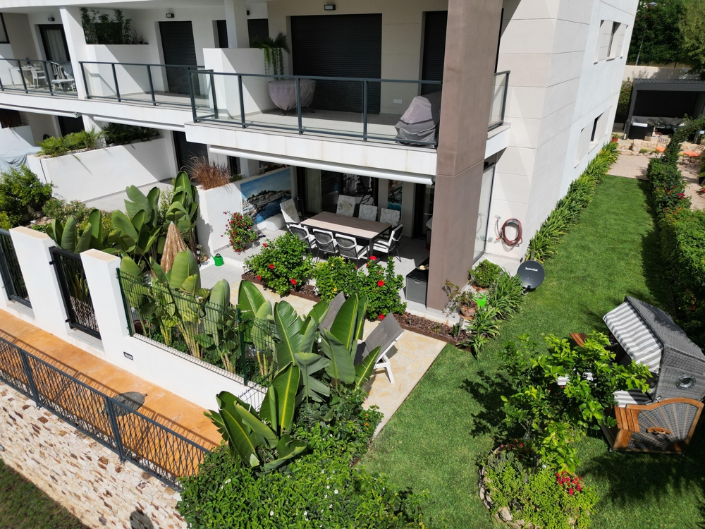 Diese Erdgeschosswohnung in Font de Sa Cala verbindet modernes Design mit viel Freiraum im Grünen. Sie befindet sich in einer im Jahr 2023 fertiggestellten Wohnanlage mit 42 Parteien. Die Wohnung hat eine bebaute Fläche von ca. 117 m² mit einer ca. 20 m² Terrasse und einem ca. 211 m² privater Garten. Der Grundriss umfasst drei Schlafzimmer, zwei geschmackvoll ausgestattete Bäder mit bodengleichen Duschen und Fußbodenheizung, sowie einen offenen Wohn- und Essbereich mit integrierter Küche. Ein Highlight ist der seitlich verlaufende Garten, der Privatsphäre und vielfältige Nutzungsmöglichkeiten bietet – ideal zur Erholung. Ergänzt wird dieser Bereich durch eine ca. 20 m² große Terrasse mit Blick ins Grüne, die zusätzlichen Raum zum Entspannen bietet. Zu den weiteren Besonderheiten der Wohnung zählt eine moderne Entkalkungs- und Osmoseanlage für beste Trinkwasserqualität. Zusätlich steht Ihnen ein Außenstellplatz sowie ein Tiefgaragenplatz mit Abstellraum zur Verfügung. Darüber hinaus können die Bewohner den gepflegten ca.25m langen Gemeinschaftspool der Anlage nutzen. Dank ihrer Kombination aus hochwertiger Ausstattung, durchdachtem Grundriss und großzügigen Außenflächen eignet sich diese Immobilie perfekt für alle, die Komfort und Naturverbundenheit verbinden möchten. Ein Großteil der Möbel kann übernommen werden.