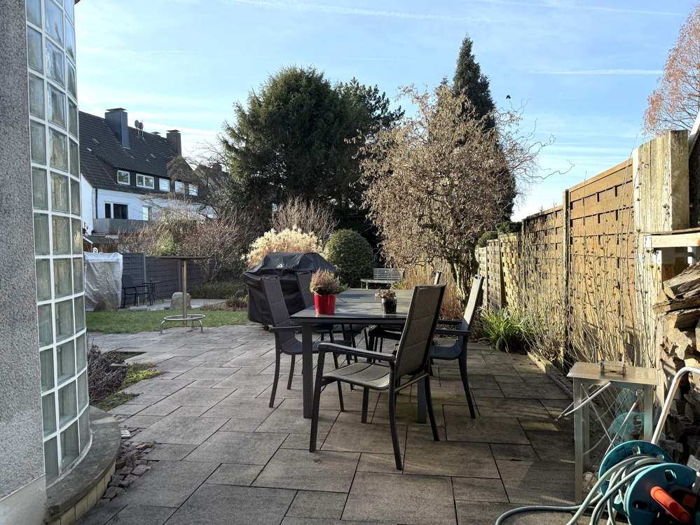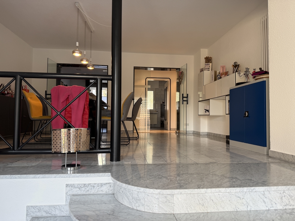 Diese attraktive Erdgeschosswohnung mit einer Wohnfläche von ca. 135 m² befindet sich im Erd- und Kellergeschoss eines gepflegten Dreifamilienhauses in zentraler Lage von Gladbeck-Mitte. Die Wohnung überzeugt durch ihre großzügige Raumaufteilung, eine besondere Split-Level-Architektur sowie eine hochwertige Ausstattung und bietet ein außergewöhnliches Wohnambiente mit direktem Gartenbezug. Über die einladende Diele gelangen Sie in die Küche, das Schlafzimmer sowie in das moderne, barrierefreie Badezimmer, das mit einer großzügigen bodengleichen Dusche ausgestattet ist. Herzstück der Wohnung ist der offen gestaltete Wohn- und Essbereich, der durch seine Split-Level-Anordnung architektonisch reizvoll gestaltet ist. Ein Kamin sorgt für eine angenehme Wohnatmosphäre, während der elegante weiße Marmorboden und die gasbetriebene Fußbodenheizung den hohen Ausstattungsstandard unterstreichen. Große Fensterflächen lassen viel Tageslicht in die Räume und öffnen den Wohnbereich direkt zum Garten, wodurch Innen- und Außenraum harmonisch miteinander verbunden werden. Im Kellergeschoss der Wohnung stehen ein weiteres Schlafzimmer, ein zusätzliches Badezimmer, ein Hauswirtschaftsraum sowie eine Sauna zur privaten Nutzung zur Verfügung. Ergänzend bietet ein renovierter Kellerraum ausreichend Stauraum für persönliche Gegenstände. Der angelegte Garten mit Teich und Geräteschuppen lädt zum Entspannen und Verweilen ein und bietet einen hohen Erholungswert inmitten der Stadt. Die Gartenfläche ist direkt vom Wohnbereich aus zugänglich und erweitert den Wohnraum ideal in den Außenbereich. Eine zur Wohnung gehörende Garage sowie ein zusätzliches Carport bieten komfortable Parkmöglichkeiten. Die zentrale Lage in Gladbeck-Mitte ermöglicht eine gute Anbindung an öffentliche Verkehrsmittel sowie kurze Wege zu Einkaufsmöglichkeiten, Ärzten, Schulen und weiteren Einrichtungen des täglichen Bedarfs. Wir freuen uns auf Ihr Anfrage!